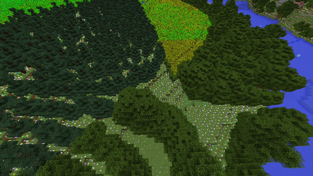 An in-world view of two types of forestry and arable land.The same expression evaluation technique is used to assign random flower types to the remaining blocks, creating varied ground cover between the trees. One note to keep in mind when planting things in Minecraft – they need something to grow from. The zero-offset blocks are assigned a grass type (dirt works as well), and then the flowers and trees are placed on it at a vertical offset of 1.