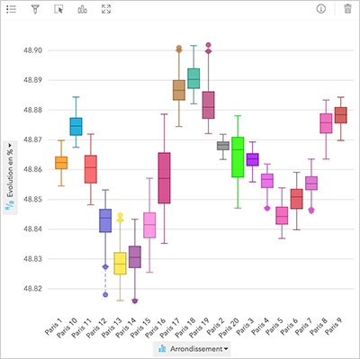 Ce type de diagramme permet d'observer la répartition statistique d'une variable numérique (min, max, médiane, quartiles) en la déclinant éventuellement par un champ de catégorie.