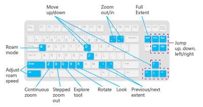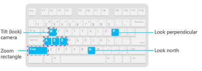 B + arrow keys | Look around using only the keyboard. | No | Yes | Press B and the Up Arrow, Down Arrow, Left Arrow, or Right Arrow keys to manipulate the camera in a 3D view to look around its current location. |