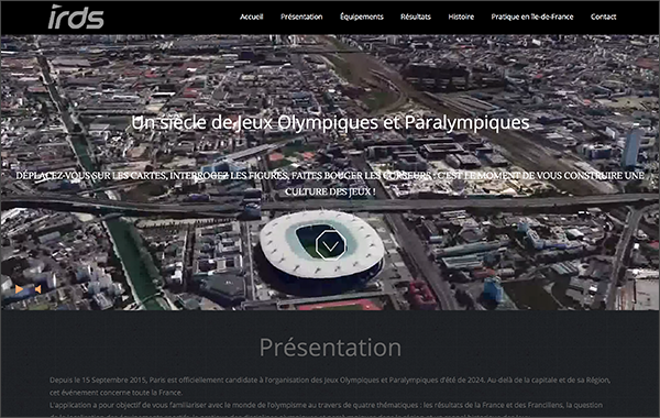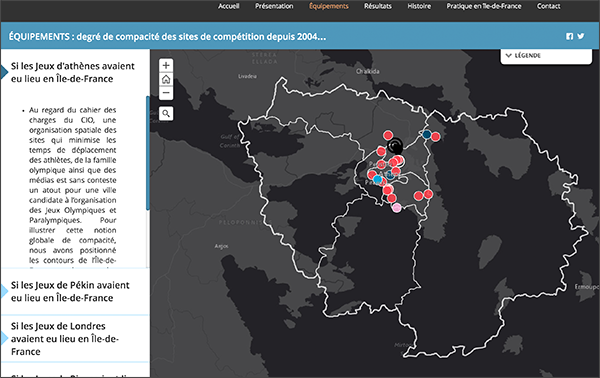 La Story Map présente des informations géographiques comme la localisation des équipements. Plutôt que de proposer des cartes successives des différentes villes ayant accueilli les JO, l'application présente à échelle constante la superposition de l'Ile-de-France sur la cartographie des précédentes éditions des JO. La comparaison en terme de compacité avec Paris 2014 est ainsi très simple.
