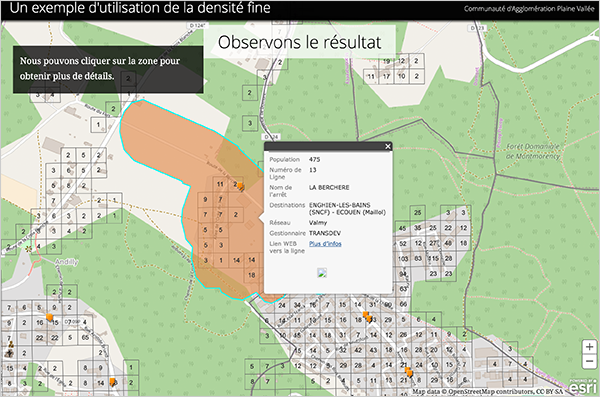 Une des difficultés que rencontre parfois le géomaticien c'est d'expliquer aux non spécialistes des SIG la manière dont ils ont réalisé son analyse spatiale (les données utilisées, les traitements appliqués, le rendu des résultats, ...). Pour cela, plutôt qu'une longue explication, il sera généralement plus efficace d'utiliser un médium de communication comme la Story Map. C'est une illustration de cette approche que je vous propose cette semaine avec cet exemple de narration cartographique réalisé par la Communauté d’Agglomération de la Vallée de Montmorency. L'objectif de l'application est d'expliquer comment utiliser des informations de densité fine pour répondre à des questions très concrètes comme: connaître la population potentiellement desservie par un arrêt de bus.