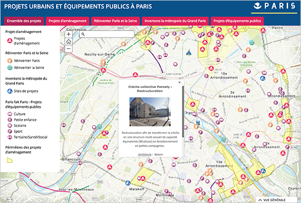 La première application permet de découvrir les projets urbains et les projets d'équipements publics pour les années à venir. Une première carte localise l'ensemble des projets de la capitale puis des onglets thématiques (aménagement, Paris et La Seine, Transports et projets liés au Grand-Paris, Equipements publics). Construite à partir du modèle Story Map Series, l'application a été légèrement personnalisée à partir du code source du template fourni par Esri.