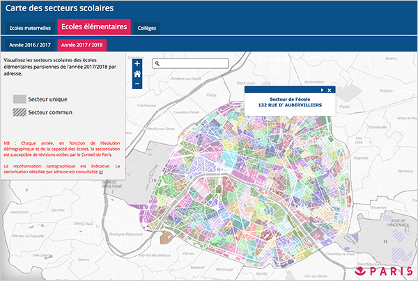 La seconde application permet de découvrir la carte scolaire et de connaître l'école maternelle, l'école primaire ou le collège dont vous dépendez en fonction de votre lieu d'habitation. Les 3 onglets principaux permettent de choisir le type d'établissement et les onglets secondaires permettent de choisir l'année scolaire 2016-2017 ou 2017-2018. Construite elle aussi à partir du modèle Story Map Series, l'application a été légèrement personnalisée à partir du code source du template fourni par Esri. On notera que l'on a imbriqué une Story Map Series dans chaque onglet de la Story Map Series principal, une bonne astuce pour avoir cette notion d'onglet principaux et secondaires sans aucun développement.