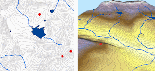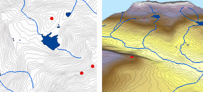 Las herramientas De topo a ráster y De topo a ráster por un archivo utilizan una técnica de interpolación diseñada específicamente para crear una superficie que representa con mayor precisión una superficie de drenaje natural y preserva mejor los cordones montañosos y las redes de arroyos de los datos de curvas de nivel de entrada.
