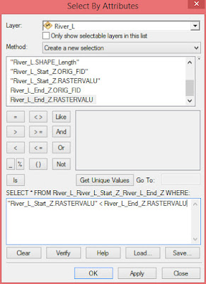 Oleh kerana field RASTERVALU tu kita join ke dalam table sungai, kita akan nampak “nama layer”.RASTERVALU pada senarai field dalam dialog Select by Attributes. Seperti dalam contoh gambar di atas, carian yang saya lakukan ialah "River_L_Start_Z.RASTERVALU" < River_L_End_Z.RASTERVALU