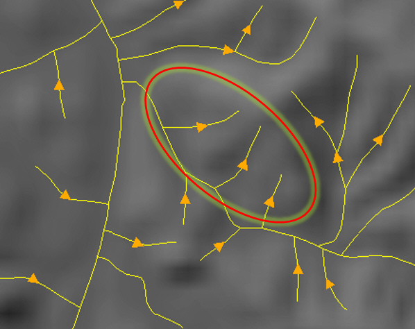 Katakan sekarang ni saya ada satu data layer sungai, dan saya nak check setiap line sungai tu betul tak directionnya. Nak tahu direction line sungai tu betul ke salah, kita kena faham dulu sifat sungai. Sungai akan mengalir dari hulu ke hilir, anak-anak sungai mengalir dari kawasan tinggi ke kawasan rendah seterusnya memasuki sungai-sungai utama yang lebih lebar. Bila dah faham tu barulah kita boleh tentukan yang mana satu direction sungai betul dan yang mana salah based on arrow symbol yang dipaparkan. Lihat contoh gambar di bawah. Sungai dalam bulatan merah menunjukkan arah sungai yang salah, seolah-olah sungai mengalir ke atas.