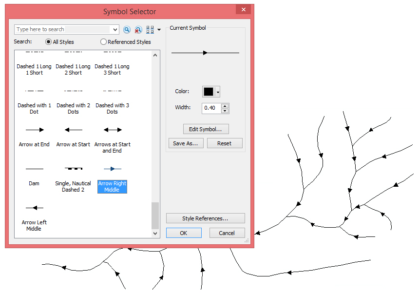 Tapi tu tak penting. Yang saya nak story kat sini, direction line dalam data GIS ni kadangkala memberi maksud sesuatu, contohnya arah aliran sungai, electricity flow dan lain-lain. Dan kadangkala, sesetengah analisis yang gunakan layer line ni sebagai data input perlukan kita set direction line yang betul dulu pada pada setiap line dalam layer tu. Dalam Arcmap macamana kita nak tgk direction setiap line ni? Caranya, kita boleh gunakan simbol Arrow untuk draw direction setiap line.