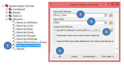 Teorinya nampak macam senang kan? Hehehehe. Tapi persoalannya macamana nak dapatkan nilai Z kat setiap hujung line sungai tu? Dalam kes saya ni ada 66,088 line sungai ... maknanya kalau satu line sungai ada dua Z (Z1, Z2), saya kena dapatkan 66,088 x 2 = 132,176 nilai Z. Huhuhu. Wait seminit…don’t panic. Tau tak, dalam ArcGIS Spatial Analyst kan, ada satu tool yang boleh pindahkan nilai Z dari raster DEM kepada layer point. Nama tool tu Extract Values to Points. Cara nak guna tool ni ada saya explain dalam post yang dulu2 kat link sini. Maksudnya, kalau saya ada data raster DEM dan kalau saya boleh dapatkan point di starting dan ending setiap line sungai, saya dah boleh dapat dah nilai Z1 dan Z2.