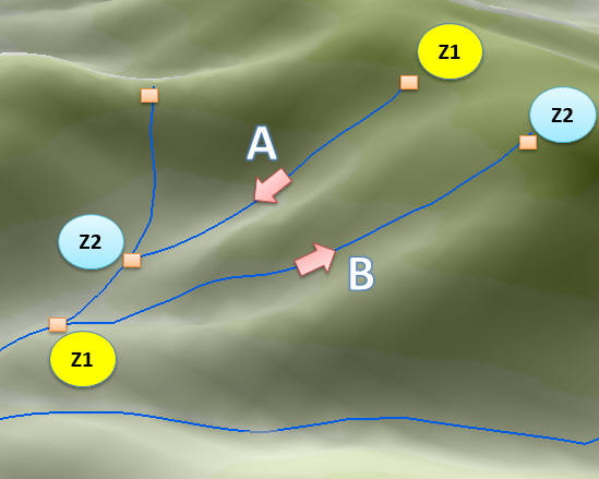 Perhatikan line direction sungai dalam gambar atas ni. Sungai A didigit dalam arah yang betul, menurun bukit, jadi ketinggian titik mula digit (Z1) lebih tinggi dari titik akhir digit (Z1). Sungai B pulak digit arah salah, mendaki bukit, jadi nilai Z dah jadi terbalik, Z1 lebih rendah dari Z2. Jadi kat sini kita boleh anggap, direction untuk sesuatu line sungai adalah salah jika Z1 < Z2. Betul tak? Maknanya kalau data sungai kita tu ada atribut Z1 dan Z2, kita boleh buat carian Z1 < Z2 untuk mencari sungai yang salah arah dan lepas tu run tool Flip Line utk betulkan semua line yang salah serentak. Tak perlu le kita cari satu-satu sungai yang salah tu manually.