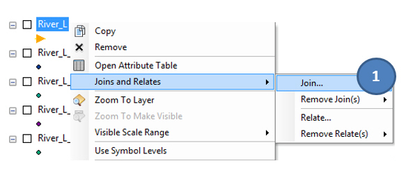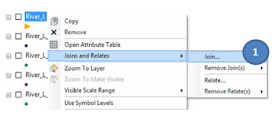 - Right click layer sungai dalam TOC ArcMap dan pilih Join and Relates > Join…