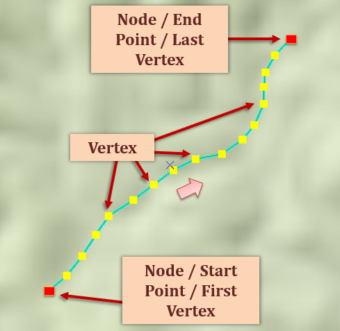 Setiap satu line terbentuk dari beberapa siri point yang dipanggil vertex. Dikedua-dua hujung line tu pulak point tu dipanggil Node atau Start Point/First Vertex atau End Point/Last Vertex, bergantung pada arah line. Saya lebih suka guna istilah Node, sebab masa saya mula-mula belajar GIS dulu, itulah istilah yang cikgu saya guna. Setiap line dia akan ada From Node dan To Node merujuk pada arah line.