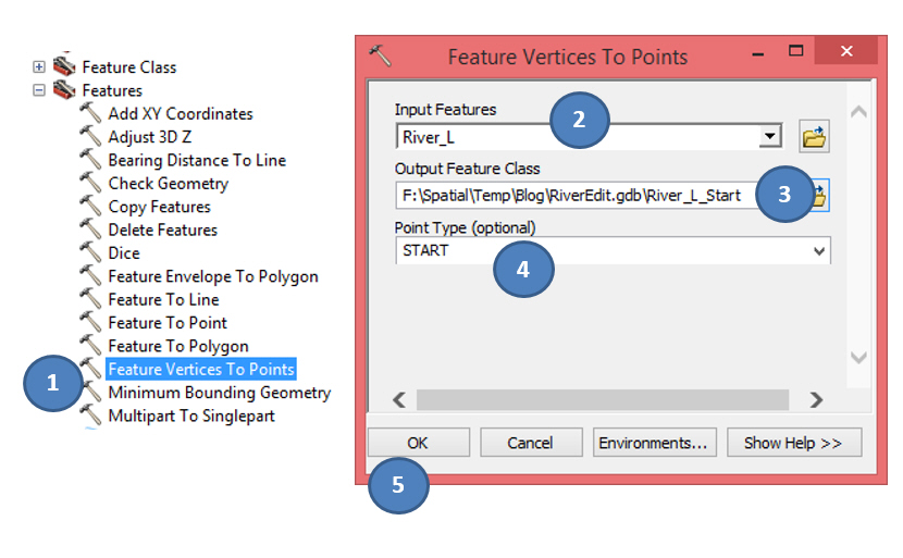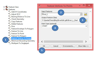 - Run tool Feature Vertices to Points untuk dapatkan point di kedua-dua hujung line sungai