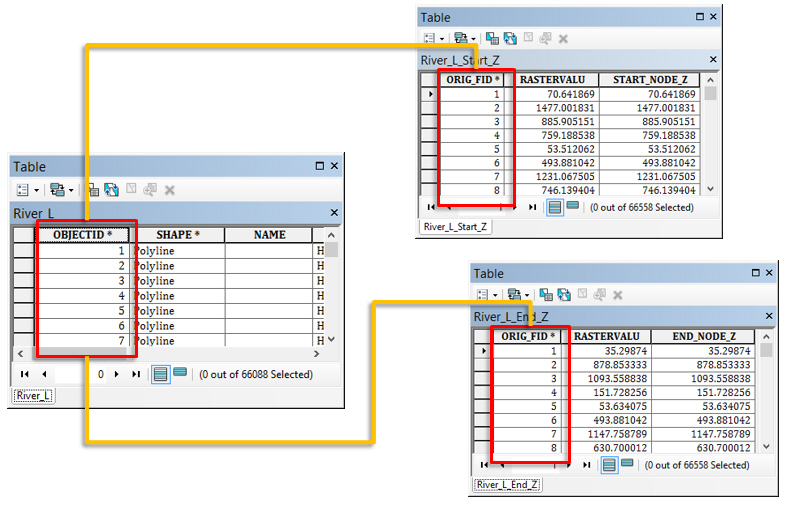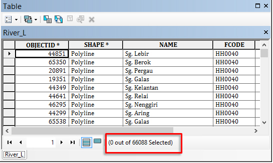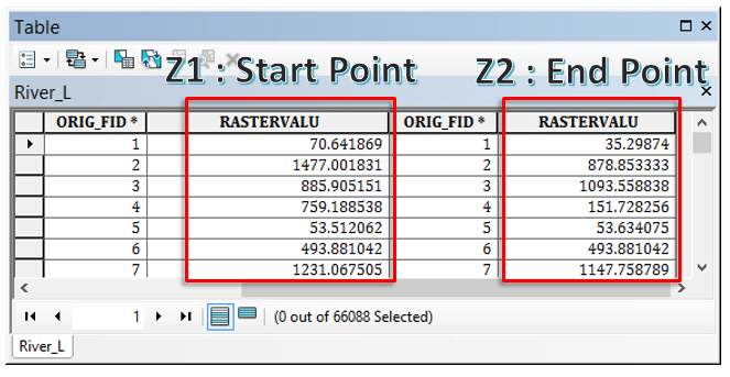 Ulangi step yang sama untuk join table end point pula. Setelah selesai join kedua-dua table, buka table layer sungai tadi. Anda akan nampak hasilnya seperti di bawah ni. Terdapat dua field RASTERVALU, masing-masing merujuk kepada start point Z dan end point Z.