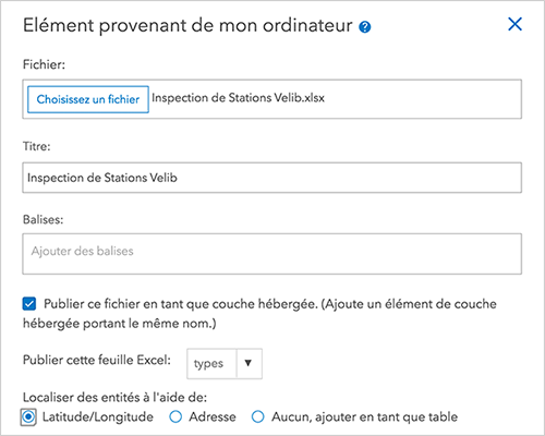 Désormais, les utilisateurs peuvent (si ils en ont les droits) publier des couches d'entités hébergées à partir de fichiers Microsoft Excel.