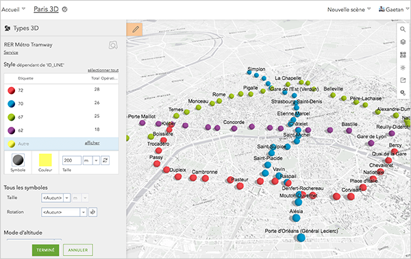 De même, pour les couches de points (2D ou 3D), vous pouvez maintenant définir des rendus basés sur des symboles 2D ou 3D en fonction des valeurs d'un attribut de la table. Vous pouvez par exemple représenter les entités avec un symboe 3D différent selon sa nature ou son type. Vous pouvez également représenter des valeurs quantitatives avec un dégrader de tailles ou de couleurs sur un symbole 2D ou 3D.