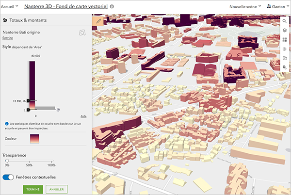 Vous pourrez désormais coloriser les objets 3D de vos couches de scènes (bâtiments par exemple). Qu'ils possèdent des textures ou non, vous pouvez appliquer une couleur unique, un dégradé de couleur (sur la hauteur du bâtiment par exemple) ou une palette de couleur sur des valeurs uniques d'un attribut (un type d'usage par exemple).