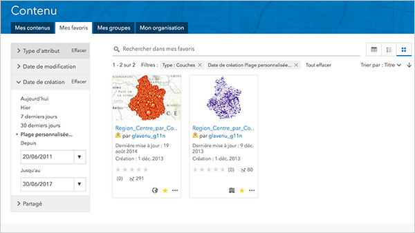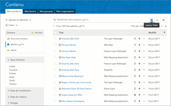 De nouveaux icônes permettent de découvrir rapidement les informations de partage de chaque élément et de les ajouter à vos favoris. Différentes options d'affichage sont désormais proposées pour présenter la liste des éléments de contenus disponibles dans un dossier ou résultant de vos recherches.