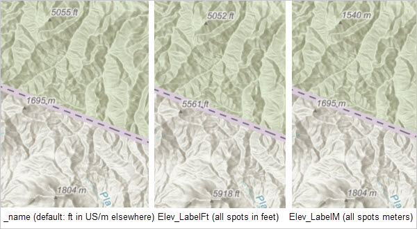 Une des améliorations importante de cette mise à jour concerne les points cotés et leurs étiquettes. Ils sont désormais disponibles par défaut dans le style "World Topographic" dans laquelle vous retrouverez les points altimétriques en pieds sur les Etats-Unis et en mètres dans le reste du Monde. Si nécessaire, vous pouvez modifier ce style (ou les autres styles) pour configurer les étiquettes d'altitude en mètres ou en pieds dans tous les pays.
