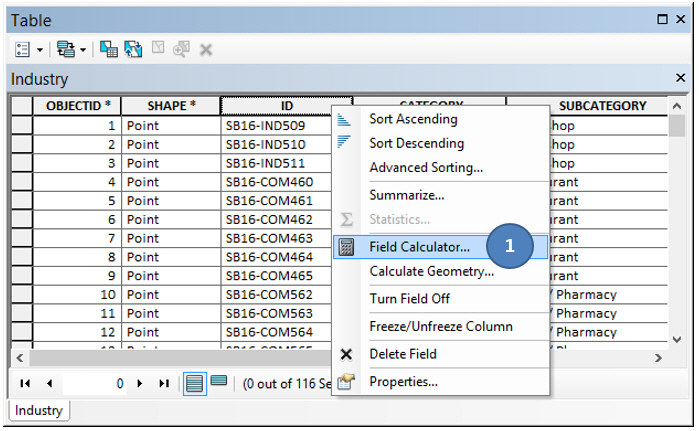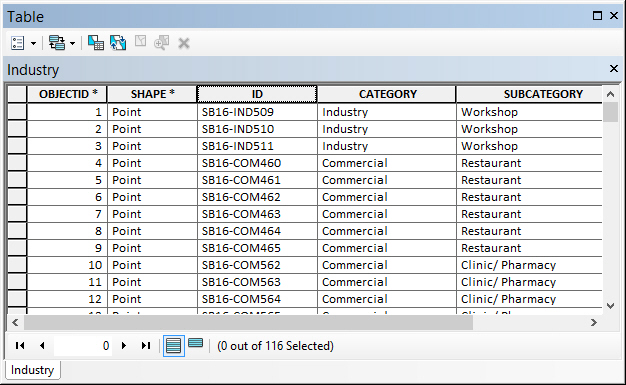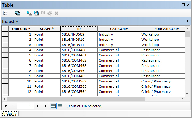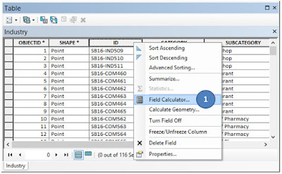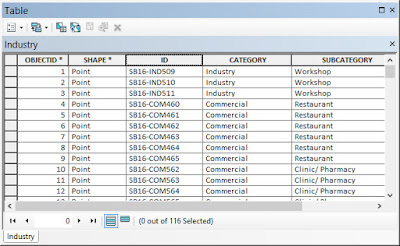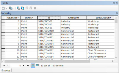 OK, dah faham format function Replace tu? Sekarang dekat celah mana pulak nak taip function Replace tu? Mula-mula paparkan dulu table anda dalam ArcMap. Contoh macam table saya paparkan di bawah ni. Table ni menunjukkan maklumat point industri serta nombor ID untuk setiap point. Sekarang ni saya nak tukarkan format ID tu dari “-“ kepada “/”.