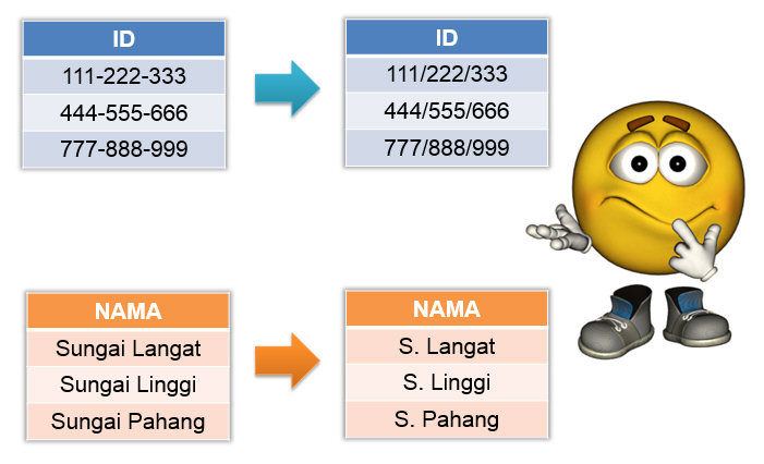 Contohnya, kalau saya nak cari teks “-“ dan gantikan kepada teks “/” yang disimpan dalam field ID, formatnya adalah :-