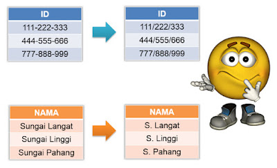 Contoh lain, kalau saya nak cari teks “Sungai” dan gantikan kepada teks “S.” yang disimpan dalam field NAMA, formatnya adalah :-