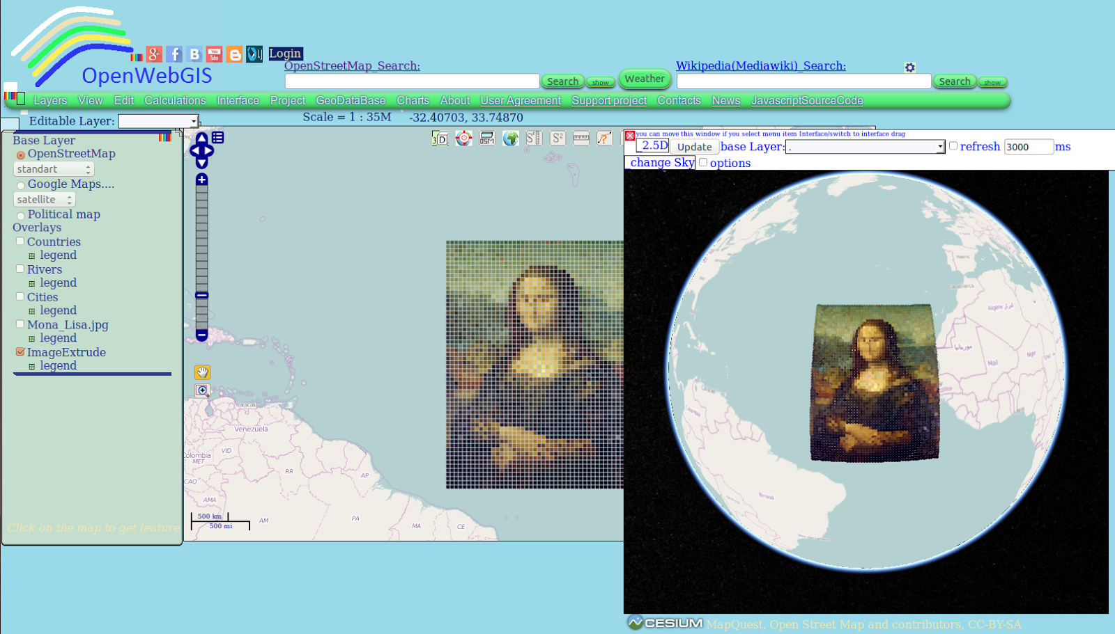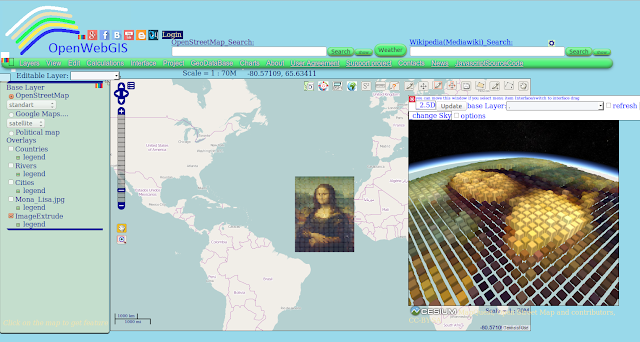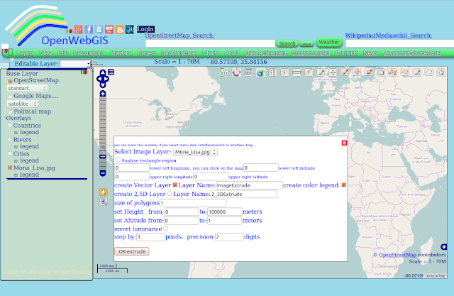 The article "Extrude image to 2D vector, 2.5D and 3D layers on the map" describes the OpenWebGIS function called "Extrude Image". How can this function be used in addition to what was described in the article? For example, you can put your photo on the map and see how it would look like if it is extruded (that means to calculate the height of each pixel depending on its luminance). It can be fun.