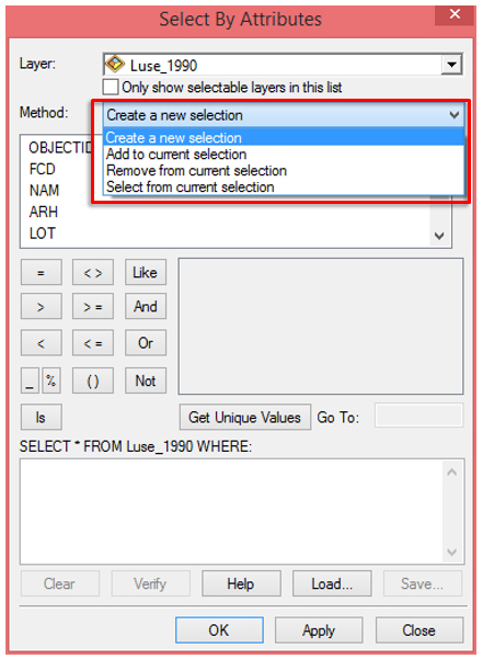 Klik pulak kat menu ArcMap Selection > Select by Attributes. Dalam dialog Select by Attributes pun ada empat pilihat kaedah selection yang sama.