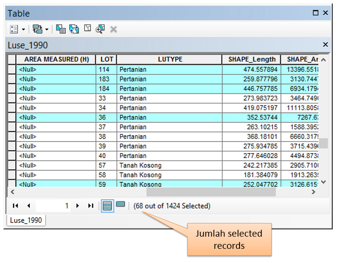 Data yang saya gunakan dalam contoh ni adalah data gunatanah, so warna-warna polygon yang anda nampak tu ada info status gunatanah, Kediaman, Pertanian, Industri etc. Next, katakan dari senarai selection tadi, saya hanya berminat nak tahu info polygon yang berstatus atribut Kediaman sahaja. Sebelum tu, terlupa plak nak cerita.. macamana anda nak tahu ada berapa jumlah rekod hasil dari selection yang anda buat? Atau dalam kata lain, ada berapa jumlah polygon yang anda dah select tu? Cara senang, buka je atribut table, kat bawah table tu ada dinyatakan berapa jumlah selected. Macam dalam gambar di bawah ni, dinyatakan ada 68 rekod/polygon result selection daripada jumlah keseluruhan 1424 rekod/polygon.