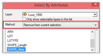 OK, dalam contoh data saya ni, disebabkan data ni dalam format geodatabase, setiap polygon ada info keluasan yang disimpan dalam field Shape_Area. Next, katakan dari hasil selection sebelum tadi, saya taknak ambil kira polygon yang berkeluasan kurang dari 2000 meter square. Semua polygon yang berkeluasan kurang dari 2000 meter square mesti dibuang dari result selection sedia ada. Cara mudah, setkan kepada kaedah Remove From Current Selection. Cara senang nak cari polygon keluasan kurang dari 2000 meter square ialah gunakan kaedah Select by Attributes kan?? Sebab info keluasan tu dah ada dalam attribute table melalui field Shape_Area. So, setting Remove From Current Selection ni kena buat dalam dialog Select by Attributes le, jangan buat kat Interactive Selection Method pulak.