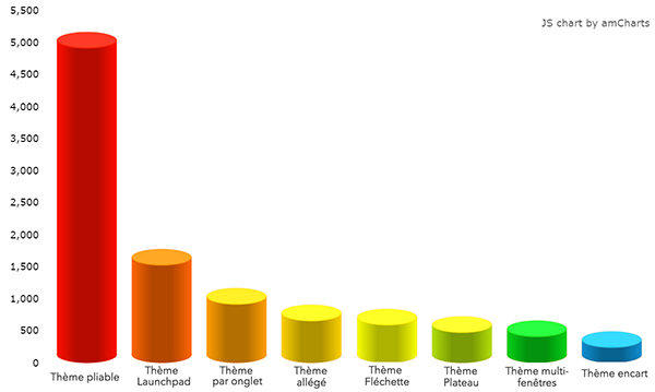 Le thème "pliable" semble être celui qui est plébiscité par les concepteurs d'apps. Ce thème plutôt compact et sobre affiche les widgets dans la barre d'en-tête et présente les panneaux d'interface dans la partie droite de l'application. Pour ce thème, 5 variantes de mise en page sont proposées pour définir le positionnement du widget de recherche et des autres widgets sans panneau d'interface.