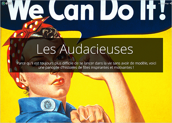 En intitulant sa narration "Les Audacieuses", l'auteur de la Story Map (Maureen Coat) met ainsi le parcours de 7 femmes exceptionnelles dont elle nous retrace la biographie en s'appuyant, notamment, sur des supports cartographiques. Elle a pour cela utilisé le modèle de Story Map Cascade d'ArcGIS Online, ce qui lui a permis de présenter les différents contenus multimédia et de construire cette narration originale.