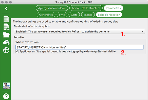 Cette capacité est activable uniquement avec l'application de conception Survey123 Connect. L'auteur du formulaire peut spécifier une requête de filtrage qui déterminera les enquêtes à faire remonter à l'utilisateur dans sa boîte de reception. Ceci permet de mettre en place des workflow assez évolués comme la création d'entités par une application tiers (ArcGIS Pro, Web AppBuilder, ...) et une mise à jour des informations associées via un formulaire Survey123.